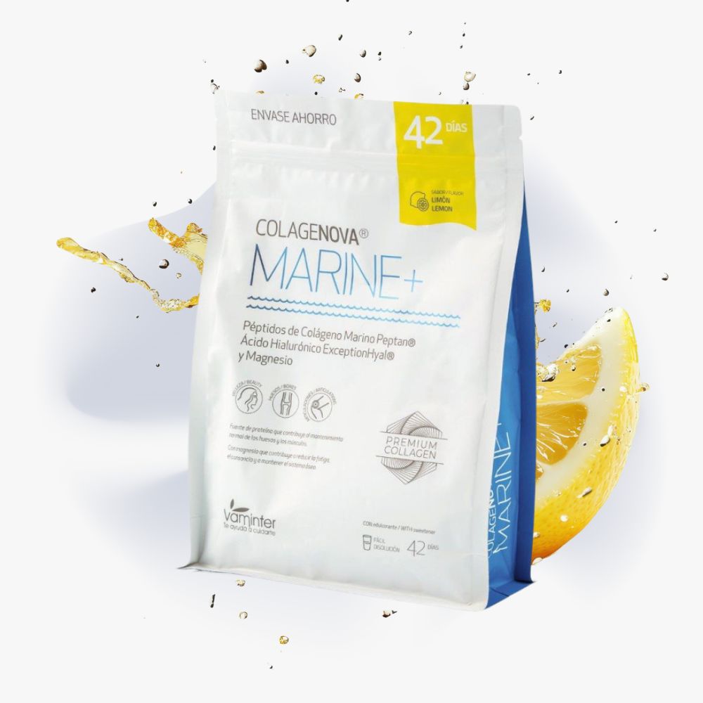 La fórmula de Colagenova Marine+ contiene colágeno hidrolizado puro procedente de pescado, que ayuda a mantener la salud, tersura, elasticidad e hidratación de la piel, los músculos, articulaciones, huesos, cabello y uñas.